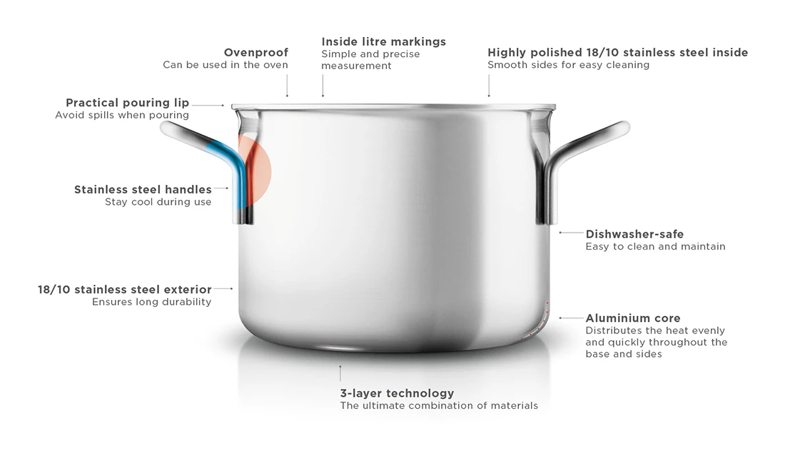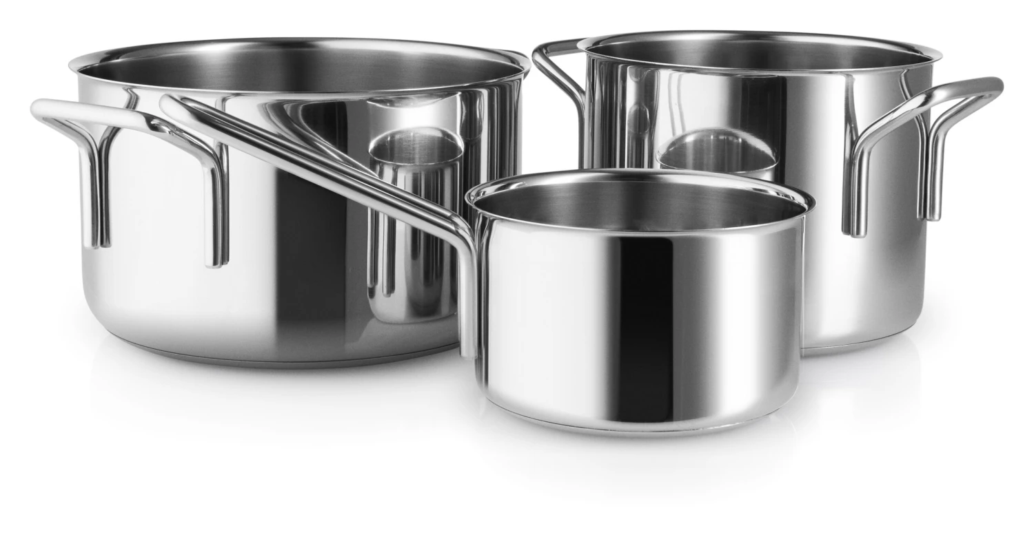 De pannenset van Eva Solo is geschikt voor dagelijks gebruik, maar ook voor speciale gelegenheden. Ze zijn gemaakt van roestvrijstaal en aluminium. Alle pannen uit de set zijn geschikt voor iedere warmtebron, ook inductie. De pannen zijn ontworpen door Ole Palsby in 1977.